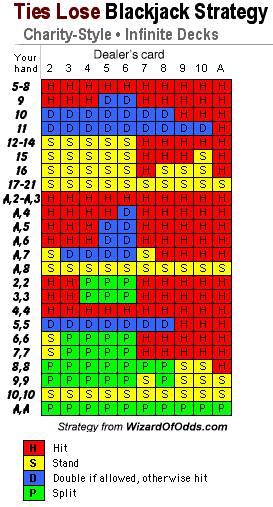 Qual é a estratégia básica para o "blackjack beneficente", onde o dealer ganha em caso de empate?