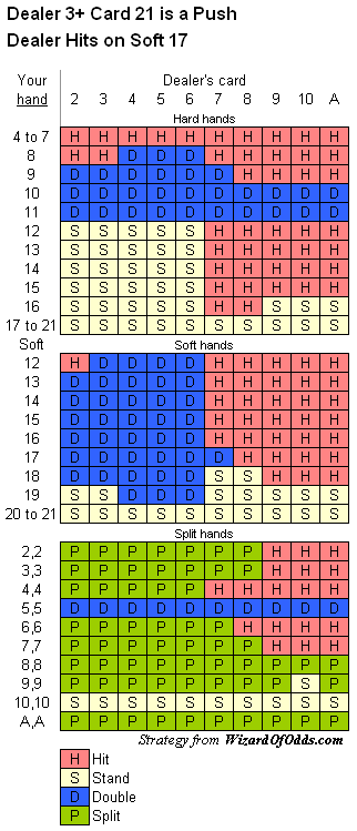 Uau! De acordo com meus cálculos, isso resulta em uma vantagem de 6,4% para o jogador. Estou supondo que a regra se aplica após dobrar e dividir. Aqui está a estratégia básica para essa regra.