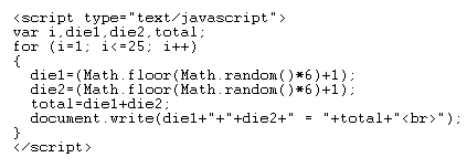 Obrigado pelo elogio. Esse programa foi escrito em JavaScript. Gerar um número aleatório é um comando simples de uma linha. A função `Math.random()` retorna um número decimal aleatório entre 0 e 1. Aqui está um programa simples para gerar 25 lançamentos de dados. Se você atualizar esta página, deverá obter resultados diferentes a cada vez.