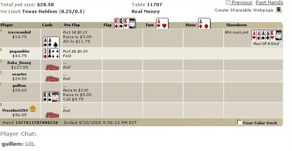 Normalmente, estou farto de perguntas sobre bad beats, mas esta foi dolorosa demais para ignorar. Antes da primeira carta ser distribuída, a probabilidade de uma quadra de reis ser derrotada por uma quadra de ases, em um jogo de dois jogadores, com ambos os jogadores tendo pares na mão, é 2 * combin (4,2) * combin(4,2) * 44 / (combin(52,2) * combin(50,2) * combin(48,5)) = 2 * 6 * 6 * 44 / (1326 * 1225 * 1712304) = 1 em 877.961.175. Este era um jogo de seis jogadores, então existem combin(6,2) = 15 pares de jogadores diferentes. Em um jogo de seis jogadores, a probabilidade é 15 vezes maior, ou 1 em 58.530.745. Após a distribuição das cartas iniciais indicadas e antes do flop, a probabilidade de a mão terminar como terminou é de 1 em 38.916.