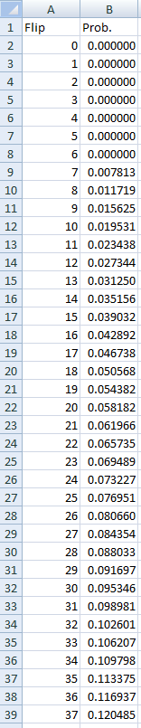 Planilhas são perfeitas para problemas como este. Nas capturas de tela da planilha abaixo, inseri uma probabilidade de 0 para as células de B2 a B8, porque não é possível obter 7 caras seguidas em 6 ou menos lançamentos. Para a célula B9, inseri a fórmula: