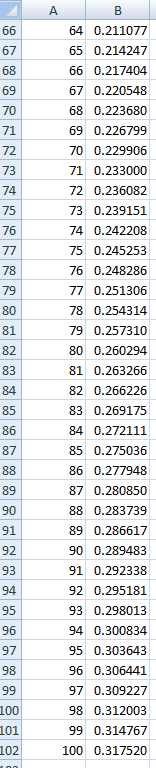 Em seguida, copiei e colei o valor das células B10 para as células B102, o que corresponde a 100 inversões. Essa probabilidade é de 0,317520. Uma simulação aleatória confirma isso.