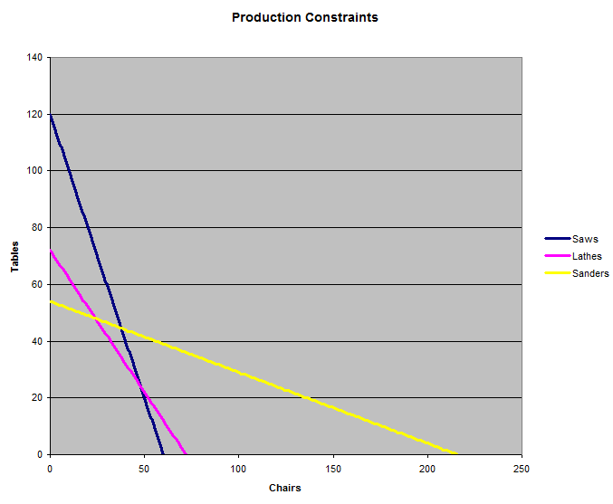 Outra possibilidade é fazer apenas mesas. O gráfico mostra que as lixadeiras serão a maior limitação. Colocando 0 cadeiras na equação (3), descobrimos que podemos fazer no máximo 54 mesas.