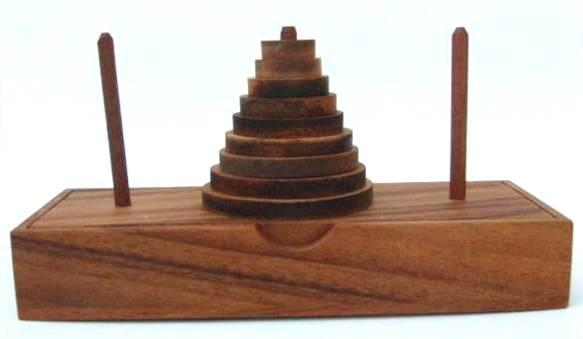 O quebra-cabeça se chama Torre de Hanói. Para facilitar a compreensão dos outros leitores, ele consiste em três pinos e um número qualquer de peças, cada uma com o mesmo formato, mas de tamanho diferente. Inicialmente, todas as peças devem estar em um pino, em ordem, com a maior na base. O objetivo é mover toda a pilha para outro pino. No entanto, você não pode colocar nenhuma peça sobre uma peça menor. Aqui está uma versão online do jogo.