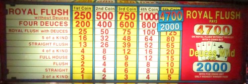 Sim, essa máquina não existe mais. Como você apontou, o jogo que antes era o segundo colocado agora ocupa o primeiro lugar. É um jogo Double Deuces com 100,92% de retorno no El Cortez. A tabela de pagamento completa é 940-400-25-16-13-4-3-2-2-1. Ela fica na sala de caça-níqueis na extremidade norte do cassino, que é cheia de máquinas antigas com tecnologia catódica. Aqui está uma foto minha ao lado dela.