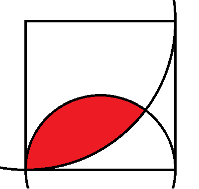 O quadrado acima tem lado de comprimento 2. Um arco é de um círculo de raio 1 e o outro de raio 2. Qual é a área da região vermelha? É permitido expressar sua resposta em funções trigonométricas.