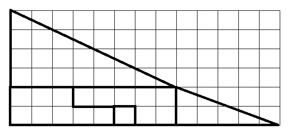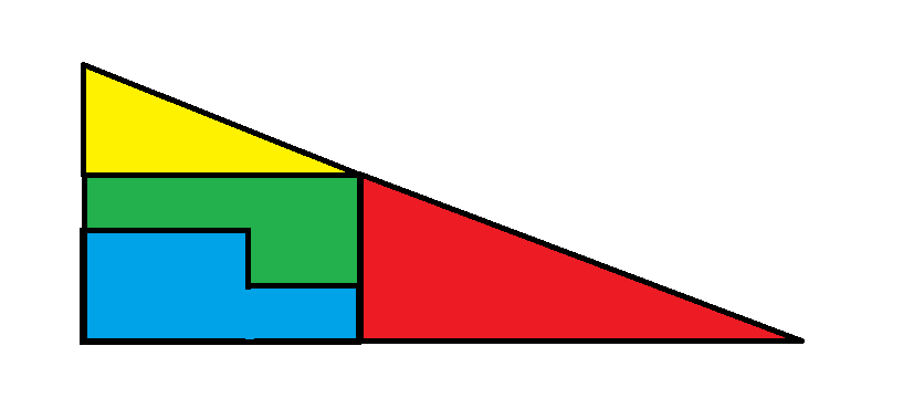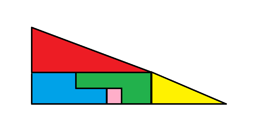 Observe que o triângulo vermelho maior tem lados de comprimento 4 e 8. Observe também que o triângulo amarelo menor tem lados de comprimento 2 e 5. Em outras palavras, os triângulos não são proporcionais. A hipotenusa dos dois triângulos não tem a mesma inclinação, conforme mostrado em cada figura. Uma tem inclinação 0,5 e a outra 0,4. Ao posicionar as peças como estão em cada figura, parece que elas formam um triângulo maior com lados de 5 e 13, mas não se trata de um triângulo.