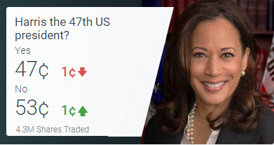 Para equilibrar suas apostas nessa situação, para cada dólar apostado em Harris na Pinnacle, aposte US$ 1,32 em Trump na PredictIt. Em outras palavras, aposte 43,1% em Harris e 56,9% em Trump.