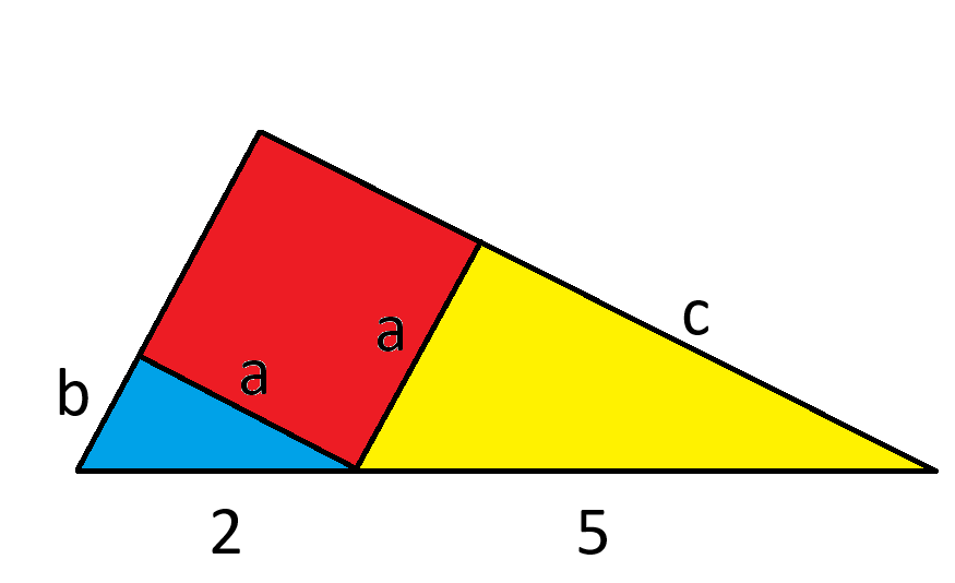 Suponha que os lados de um quadrado de lado a sejam estendidos sobre uma linha abaixo do quadrado, criando distâncias de 2 e 5 sobre a linha.