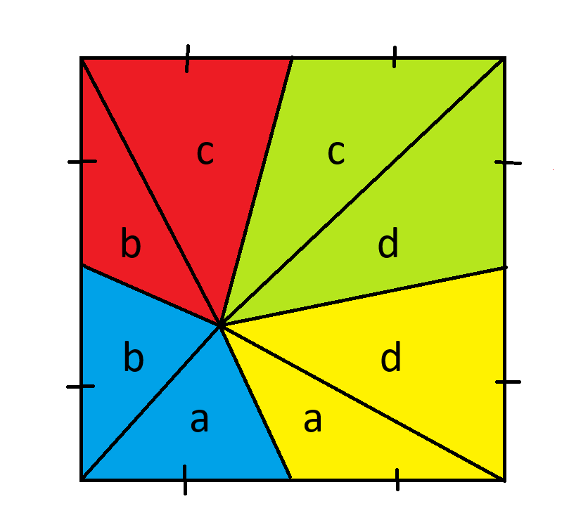 Primeiro, trace quatro linhas da interseção das quatro peças até cada canto. Em seguida, identifique as oito peças da seguinte forma.
