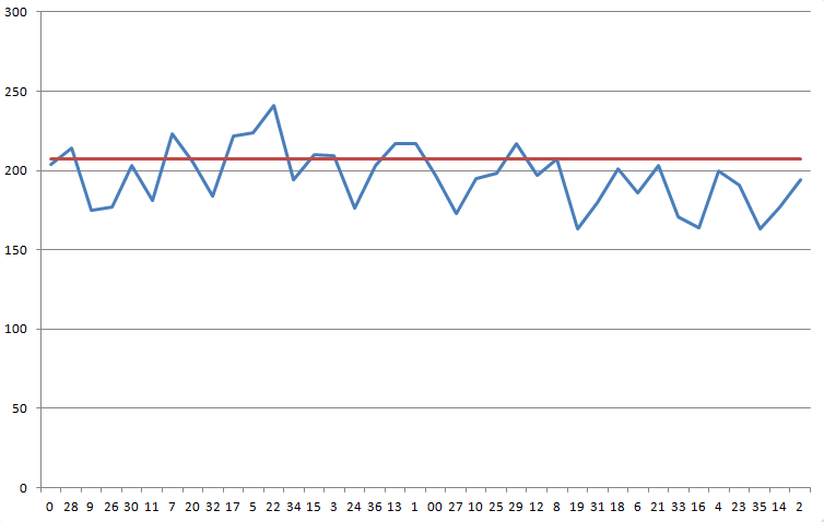 O gráfico a seguir mostra seus resultados em ordem sequencial na roleta. A linha azul mostra seus resultados. A linha vermelha representa o número que você precisa, 207,11, para superar a vantagem da casa de 5,26%.