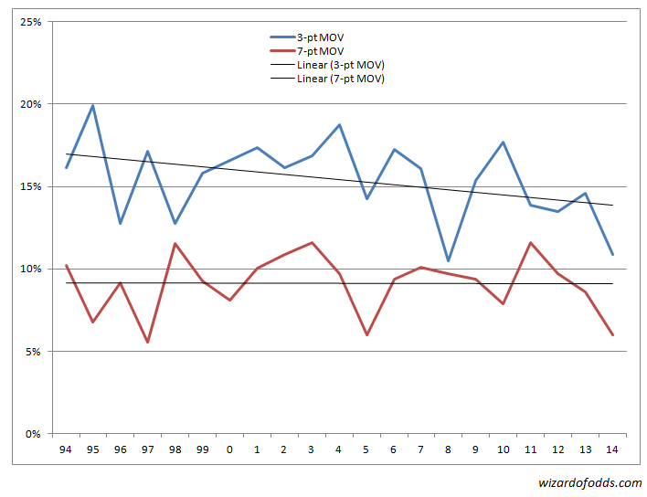 A linha "Empate" representa os cinco jogos nas 16 temporadas que terminaram empatados, então não vamos contá-los. A linha "0" representa os 43,7% dos jogos em que o time vencedor nunca esteve atrás no placar.