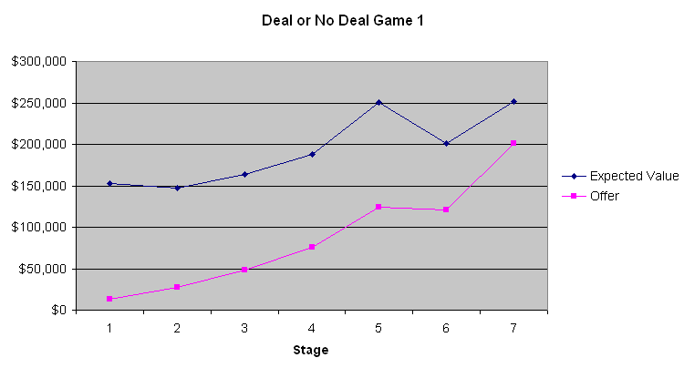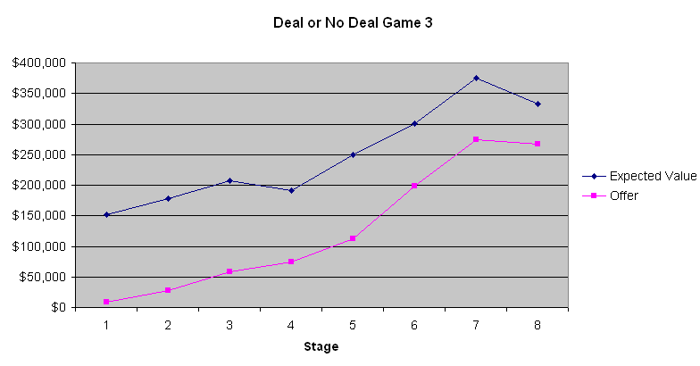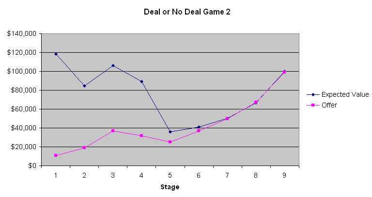 A conclusão mais óbvia a se tirar desses três gráficos é que as primeiras quatro a seis ofertas do banco são péssimas. A mala média contém US$ 131.477,54 antes mesmo de ser aberta. Oferecer apenas de US$ 9.000 a US$ 13.000 na primeira etapa é um negócio que só um tolo aceitaria. No entanto, gradualmente, as ofertas melhoram. O Jogo 2 mostra que os valores esperados eram quase os mesmos que as ofertas do banqueiro no final do jogo, quando o valor esperado do jogador era relativamente baixo. Contudo, nos Jogos 1 e 3, quando os valores esperados eram maiores, o banqueiro aparentemente estava tentando se aproveitar da aversão ao risco da maioria das pessoas quando grandes quantias estão envolvidas. Não sei se isso fez diferença, mas o participante do Jogo 2 parecia ser um apostador que queria ganhar muito. Com base nos comentários do apresentador, que se comunica com o banqueiro por telefone, o banqueiro parece levar em consideração as palavras e ações dos participantes. Se eu estivesse no lugar do banqueiro, agiria de forma muito parecida.