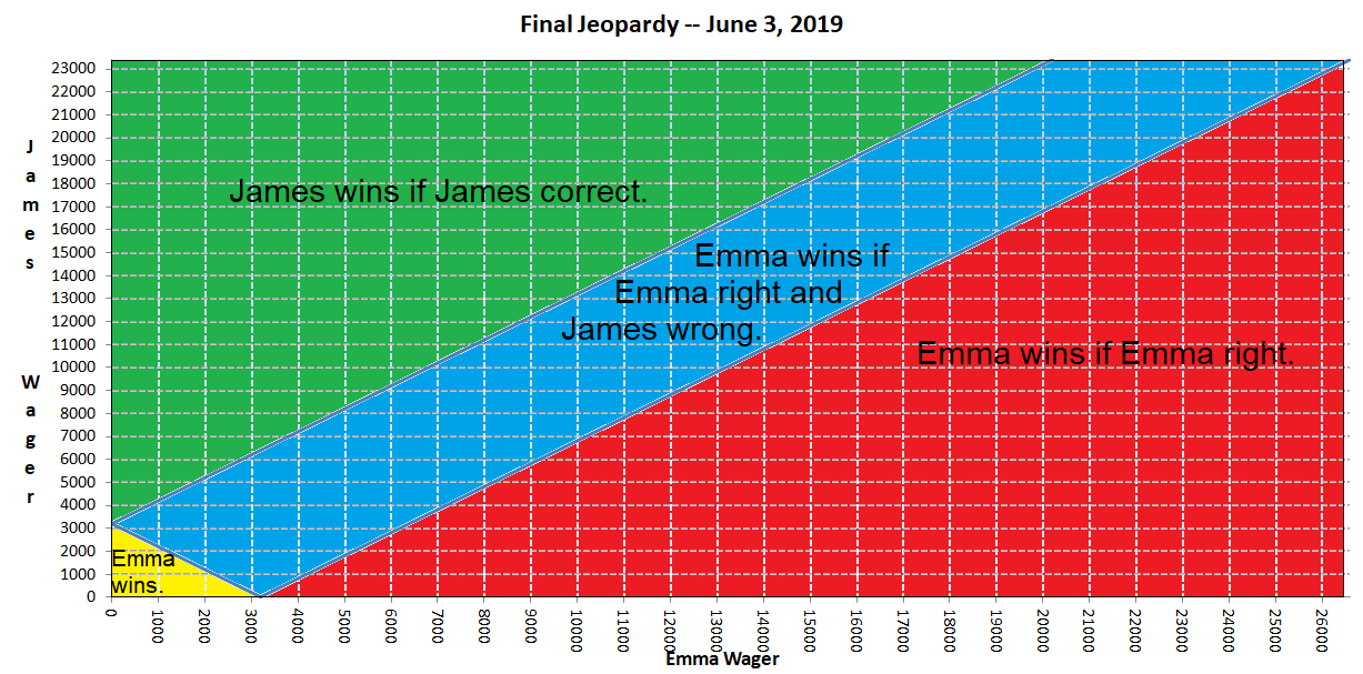 Antes de prosseguir, gostaria de relembrar ao leitor uma mudança nas regras do Jeopardy referente a empates após a rodada final. Não é mais automático que ambos os jogadores avancem, mas sim que haja uma pergunta de desempate de morte súbita. Veja um exemplo dessa situação .