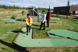 Na manhã de 16 de junho, fiz minha corrida matinal de costume e notei um campo de minigolfe (ou o que vocês chamam de "putt-putt golf" na costa leste) e um lago com aluguel de canoas. O minigolfe ficava anexo a um campo de golfe Black Diamond "Midnight Sun" , no qual eu adoraria ter jogado. Lá, tomamos um delicioso café da manhã no clube, que incluía minigolfe grátis. O campo estava um pouco deteriorado, com grama crescendo nos buracos, mas os buracos com temática do Alasca o tornaram divertido mesmo assim.
