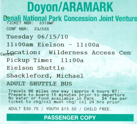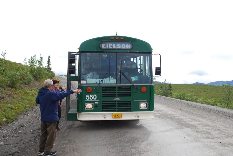 Ao contrário de Zion e do Grand Canyon, que são relativamente acessíveis e bem estruturados, o acesso a Denali é feito por uma estrada de terra sinuosa de 148 quilômetros. Além disso, em vez de usar ônibus gratuitos e confortáveis, em Denali ficamos presos em ônibus escolares verdes, velhos e feios, pelos quais tivemos que pagar um extra. Havia alguns outros ônibus com aparência melhor, mas acho que é preciso fazer parte de um pacote turístico pelo Alasca para usá-los. Passar boa parte de um dia em um desses ônibus verdes, percorrendo uma estrada de terra, não é a ideia de férias relaxantes para um rapaz da cidade como eu. Talvez eu tenha tido sorte de conseguir embarcar em um, porque o número de ônibus é limitado e eles estão quase sempre lotados. Acho que a maioria das pessoas comprou as passagens com antecedência. O custo da minha passagem de ida e volta para o Centro de Visitantes Eielson, a 106 quilômetros de distância (não confundir com a base da Força Aérea perto de Fairbanks), foi de US$ 30,75.