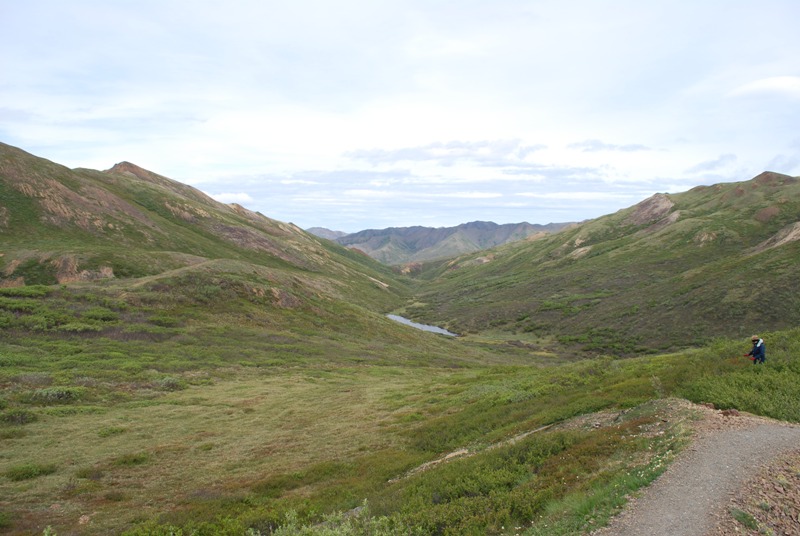 Então, reclamei dos ônibus, mas e as vistas do parque e da vida selvagem? Não vou dizer nada de ruim sobre o parque em si (ainda). Provavelmente foi a parte "menos afetada pela civilização" da América que já vi. Na maior parte do tempo, eram quilômetros e quilômetros de colinas e pequenos picos, com as montanhas maiores da Cordilheira do Alasca e o Monte McKinley mais distantes. No entanto, para este caminhante, foi deprimente apreciar a vista de um ônibus escolar, quando é permitido caminhar e acampar em praticamente qualquer lugar do parque. Sem trilhas, apenas a natureza exuberante. Não existem muitos lugares assim na América hoje em dia. Contudo, se você está em um ônibus escolar, toda essa liberdade e potencial para aventura não lhe servem de muita coisa.