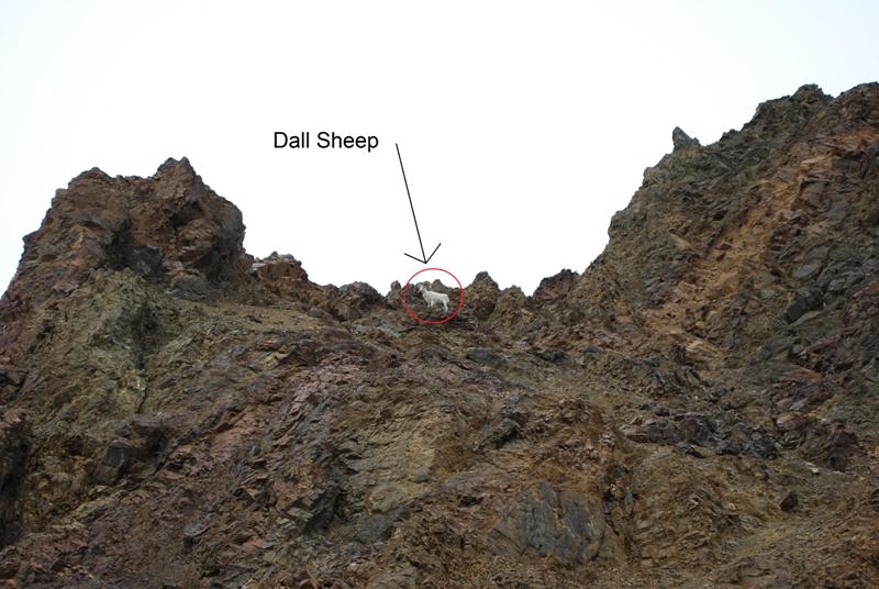 E quanto à vida selvagem? Muitos cartões-postais do Parque Nacional Denali mostram ônibus esperando famílias de ursos atravessarem a estrada. Até os guias turísticos dizem que Denali é um dos melhores lugares da América para observar animais selvagens. No início da viagem, o motorista disse que qualquer pessoa no ônibus deveria gritar "pare!" se visse alguma coisa. Isso aconteceu duas vezes conosco. Uma vez foi por causa de um carneiro-de-dall , que algum outro passageiro teve a perspicácia de avistar no alto de um penhasco rochoso perto da estrada. Devo admitir que conseguimos vê-lo bem, principalmente através da lente zoom da minha câmera. A outra parada foi para três ursos — uma mãe e dois filhotes — bem ao longe, em uma colina. Alguém devia ter binóculos bons para vê-los. Eu só consegui distinguir a mãe dormindo como um pontinho ao longe. Se não tivessem me dito que era um urso, eu jamais teria percebido.