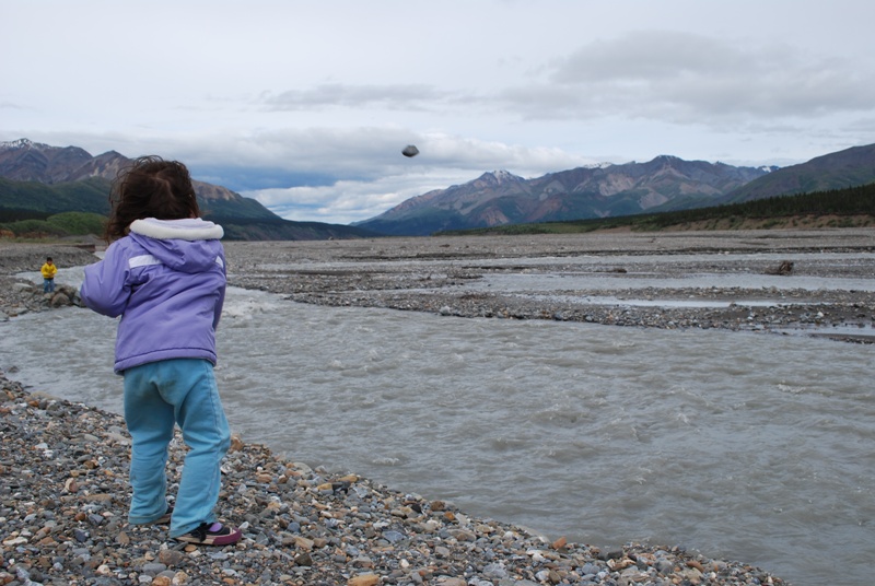 O Centro de Visitantes de Toklat era uma estrutura semelhante a uma tenda, parecida com o Cassino Pauma perto de San Diego, mas muito menor. O interior era basicamente uma loja de presentes, com algumas modestas exposições educativas. Do lado de fora, havia um leito de rio muito largo com água corrente em alguns trechos. Passamos cerca de uma hora à beira do rio, jogando pedras na água. A correnteza estava forte e fria demais para tentar atravessá-lo. O primeiro ônibus que tentamos pegar para voltar não tinha cinco lugares disponíveis, mas o próximo, felizmente, tinha, por pouco.