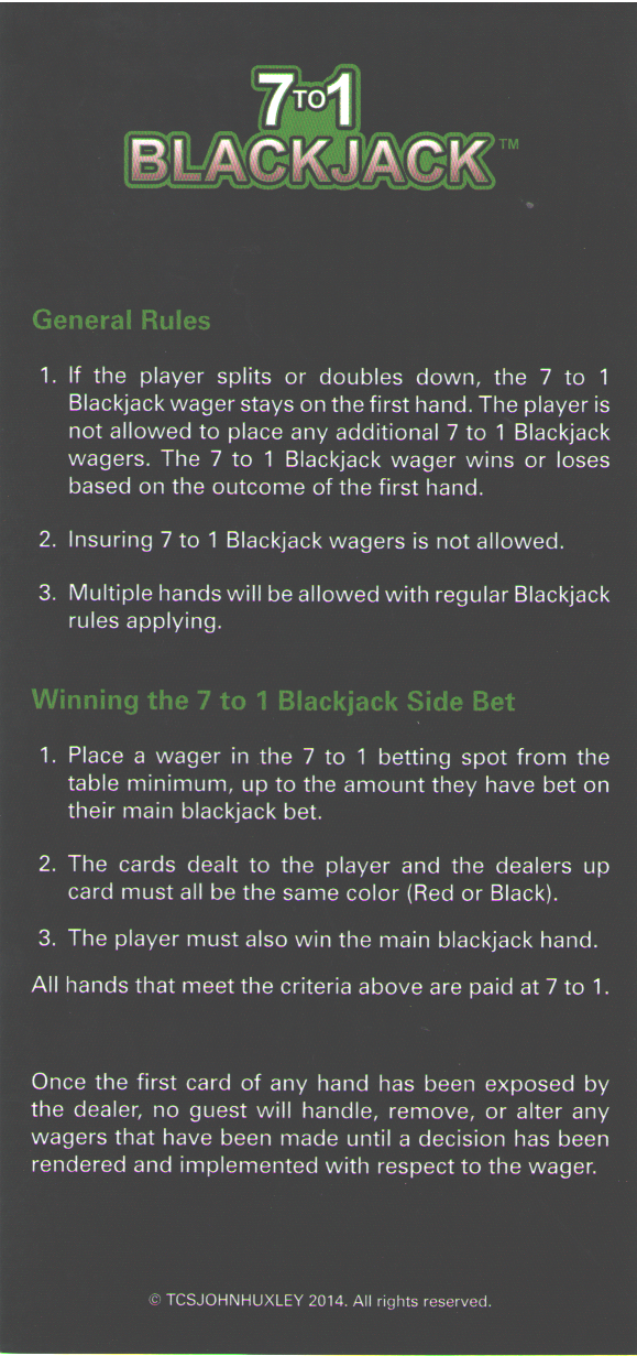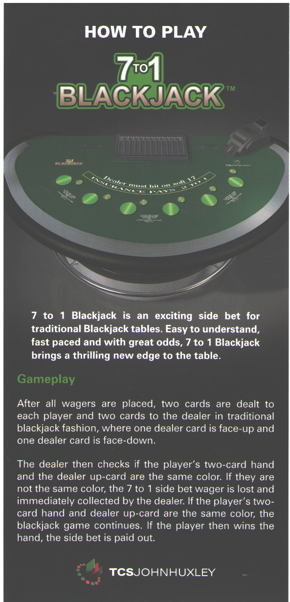 Esta aposta paralela no blackjack paga 7 para 1 se as duas primeiras cartas do jogador e a carta do dealer forem da mesma cor E o jogador ganhar a aposta no blackjack. Existe outra versão chamada Blackjack 3 para 1, onde apenas as cartas do jogador precisam ser da mesma cor. Jogo criado por TCS John Huxley.