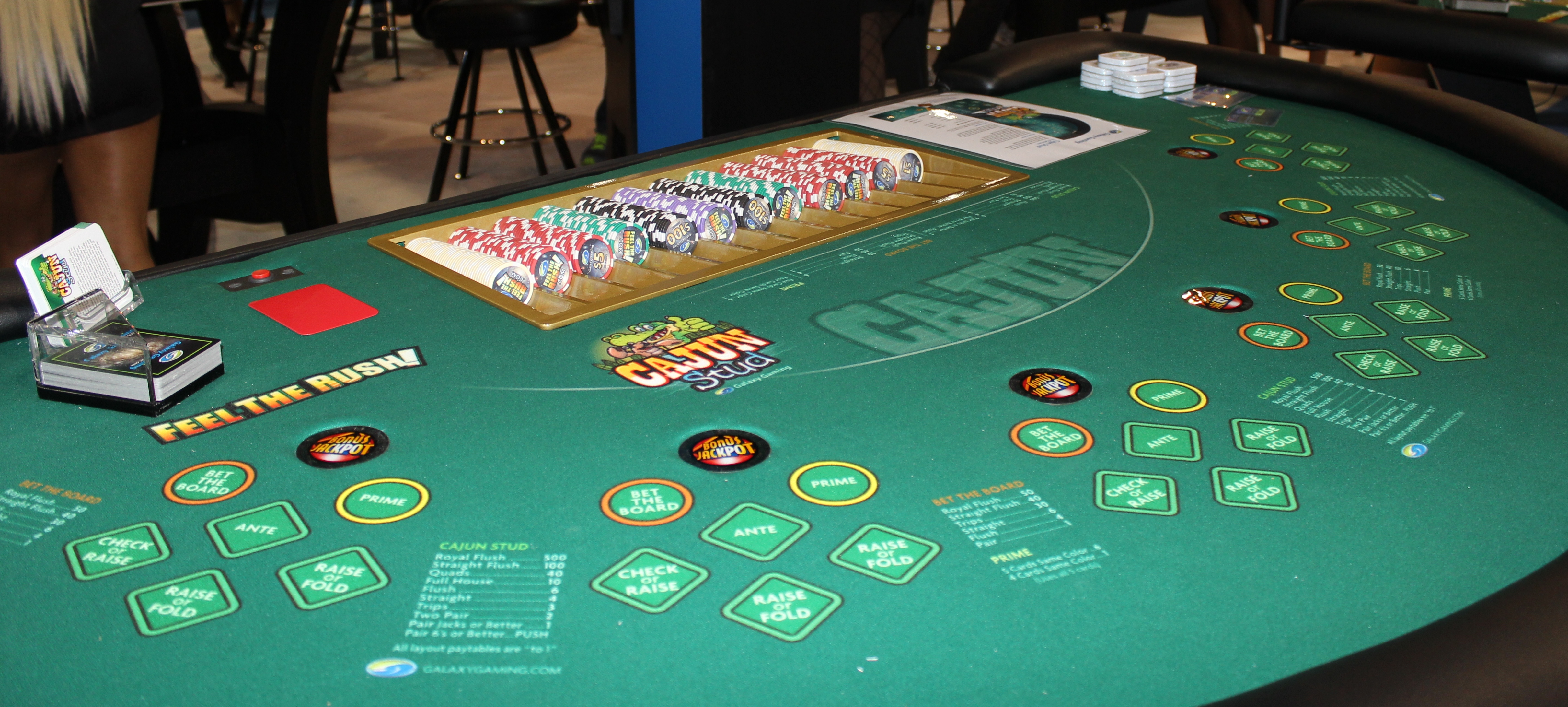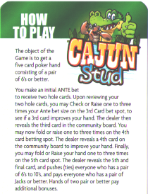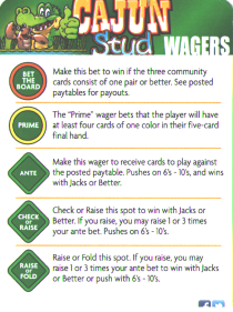 Para mim, Cajun Stud parece igual a Mississippi Stud Poker, com algumas apostas paralelas adicionadas. Desenvolvido pela Galaxy Gaming.