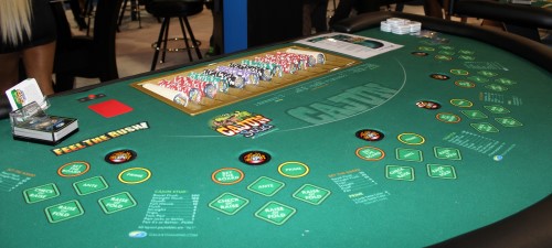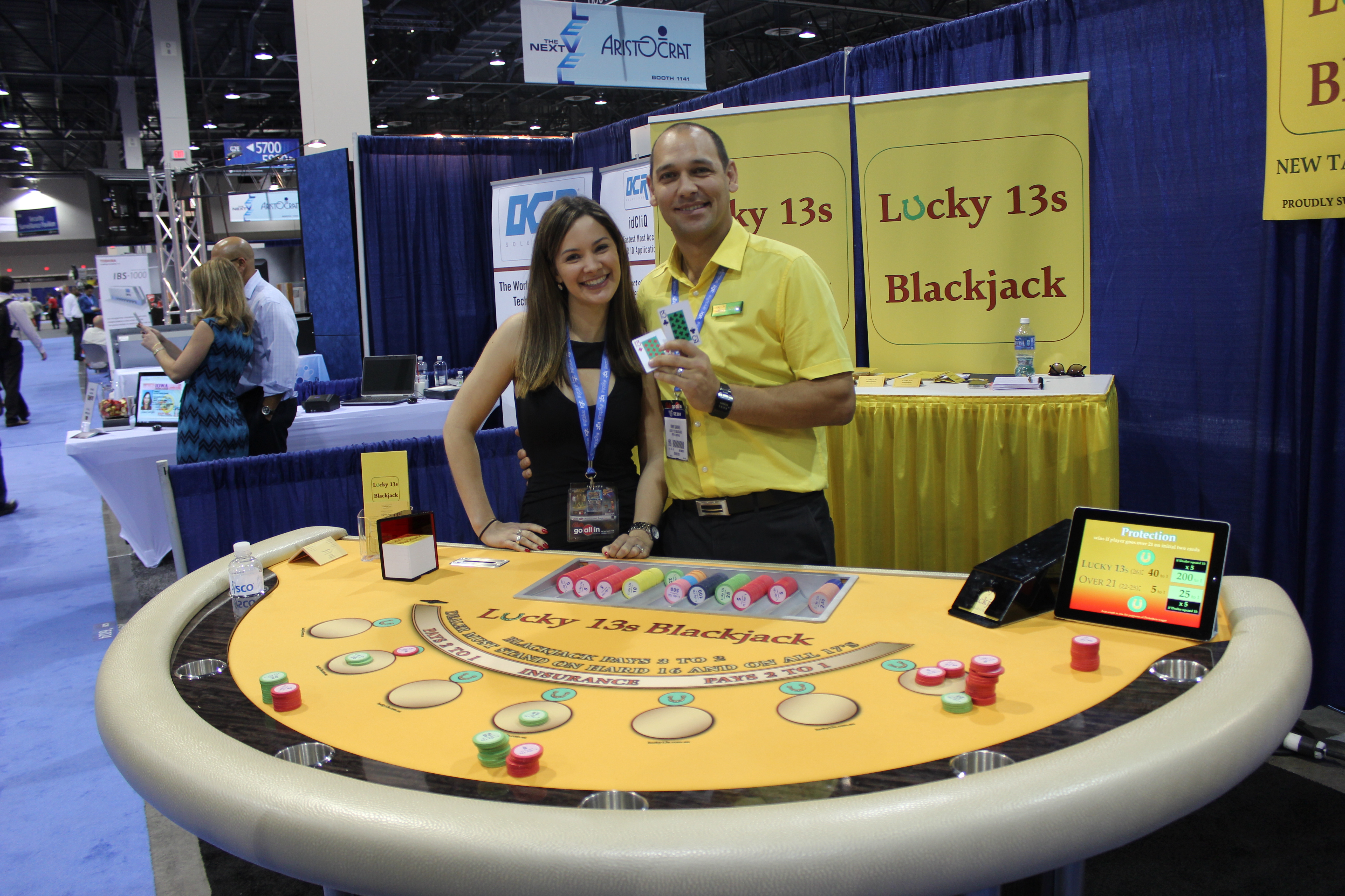 Um dos jogos mais interessantes da feira, e creio que o único jogo de mesa com um estande exclusivo. É blackjack, só que usa baralhos de 64 cartas. As 12 cartas extras são os 11, 12 e 13. Há uma aposta paralela para se proteger contra a possibilidade de estourar nas duas primeiras cartas. Mérito total pela iniciativa de inovar!