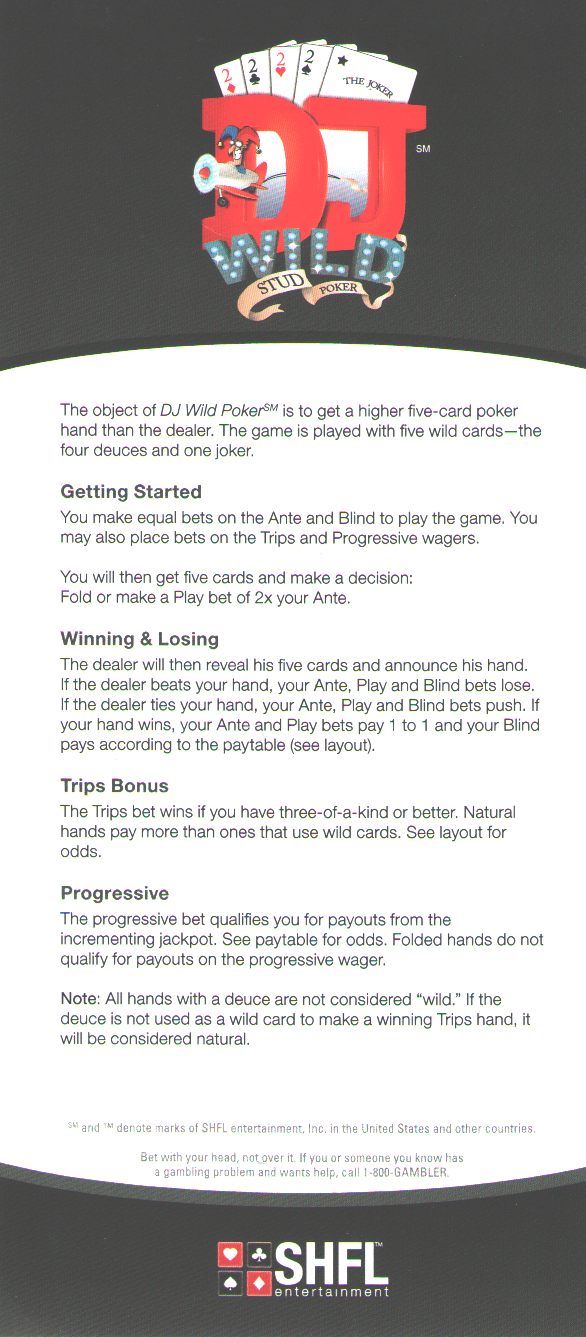 DJ Wild parece com Caribbean Stud Poker , só que com os dois e um curinga como curingas, além de algumas apostas paralelas. Da SHFL Entertainment.