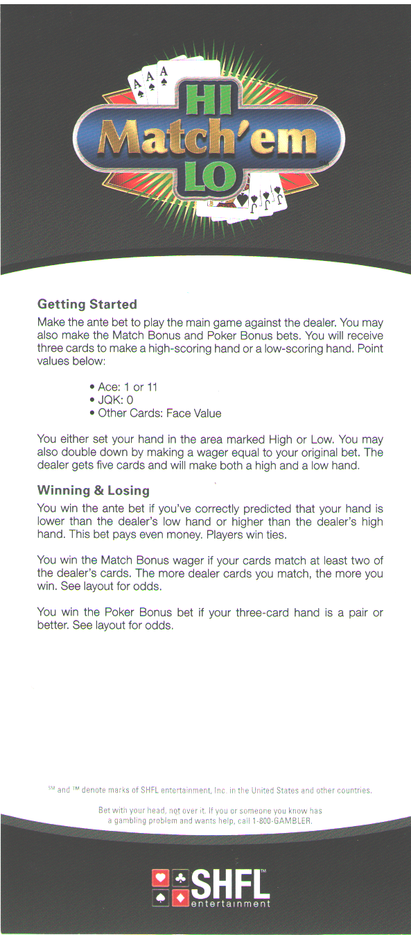 Este é um dos poucos conceitos de jogos novos apresentados por uma grande marca no evento. As cartas são pontuadas como no blackjack, exceto que as figuras valem zero. O jogador recebe três cartas e escolhe se quer jogar com uma mão alta ou baixa contra o dealer, com a opção de aumentar a aposta. O dealer recebe cinco cartas e joga com uma mão alta e uma mão baixa. Se você vencer o dealer na sua escolha, você ganha. Claro, também há uma aposta paralela. Da SHFL Entertainment.