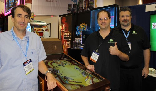 Vegas 2047 Pinball foi, de longe, a ideia mais inovadora da feira. O jogo em si é uma representação eletrônica muito realista de uma máquina de pinball. O gabinete parecia uma engenhoca de cobre e latão, como as que se encontram em jogos da série Myst. Me disseram que esse estilo é chamado de Steampunk .