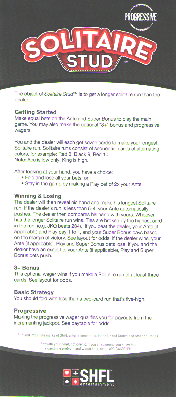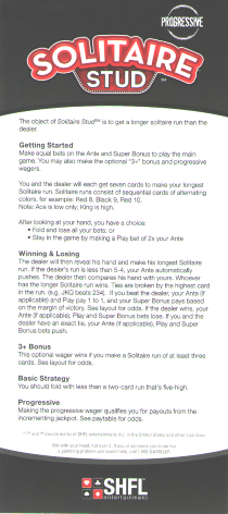 Solitaire Stud é muito parecido com High Card Flush , exceto que, em vez de se basear na maior sequência de flush, se baseia na maior sequência de solitaire, definida como uma sequência de cartas de cores alternadas. E, claro, algumas apostas paralelas também estão incluídas. Da SHFL Entertainment.