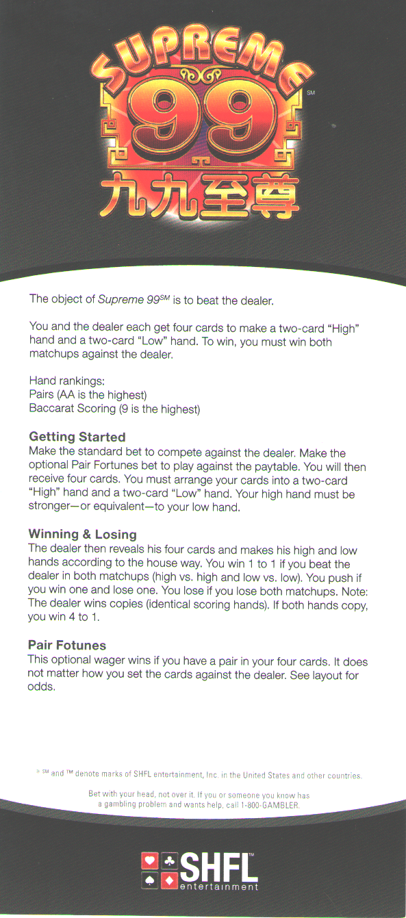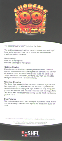O jogo mais parecido com Supreme 99 é o pai gow (tiles) .No entanto, em vez de peças, o jogo usa cartas. Assim como no pai gow, o jogador e o crupiê recebem quatro cartas cada e as organizam em duas mãos de duas cartas. A classificação é semelhante à do pai gow, em que os pares são considerados as cartas mais altas, e a pontuação segue as regras do bacará. As duas mãos mais altas são comparadas, assim como as duas mais baixas. Se o jogador ganhar em ambas as mãos, ele recebe o valor apostado, sem comissão. A vantagem da casa vem inteiramente do crupiê ganhar com as apostas duplas. Por fim, há uma aposta paralela sobre se o jogador terá algum par entre suas quatro cartas.