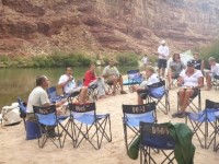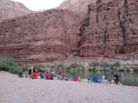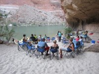 Depois disso, Amanda conversou com os líderes de outras empresas de rafting sobre seus planos de acampamento para aquela noite. Não conseguimos ir muito além de Phantom Ranch porque a maioria de nós ia fazer a trilha para fora do cânion no dia seguinte. Estaríamos em apuros se todos os acampamentos restantes estivessem ocupados.