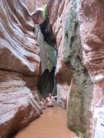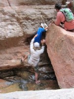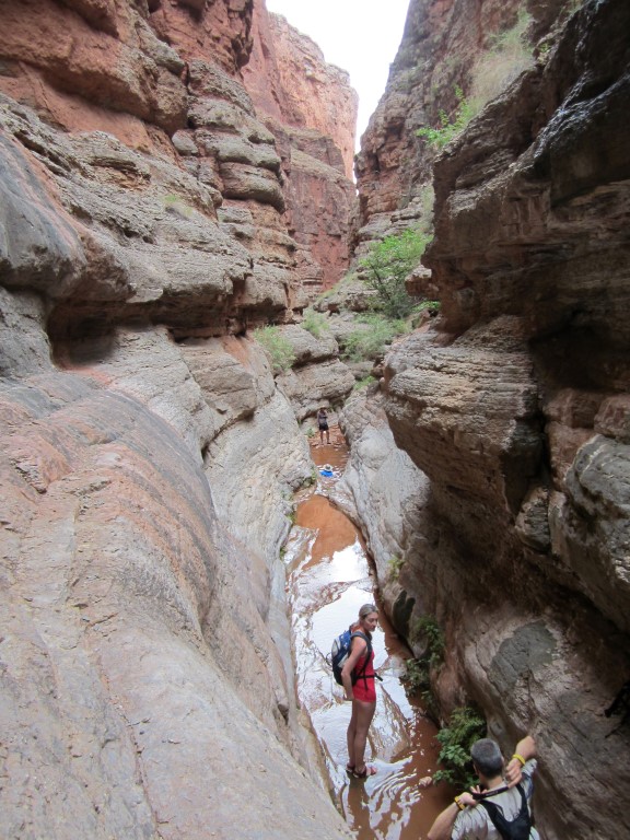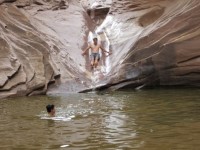 Para nossa caminhada, fomos um pouco para dentro do North Canyon, que era um dos centenas de cânions ao lado. Nosso destino era um tobogã natural de pedra com uma piscina logo abaixo. Isso ilustra por que recomendo usar roupa de banho o dia todo.