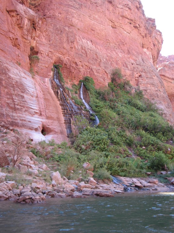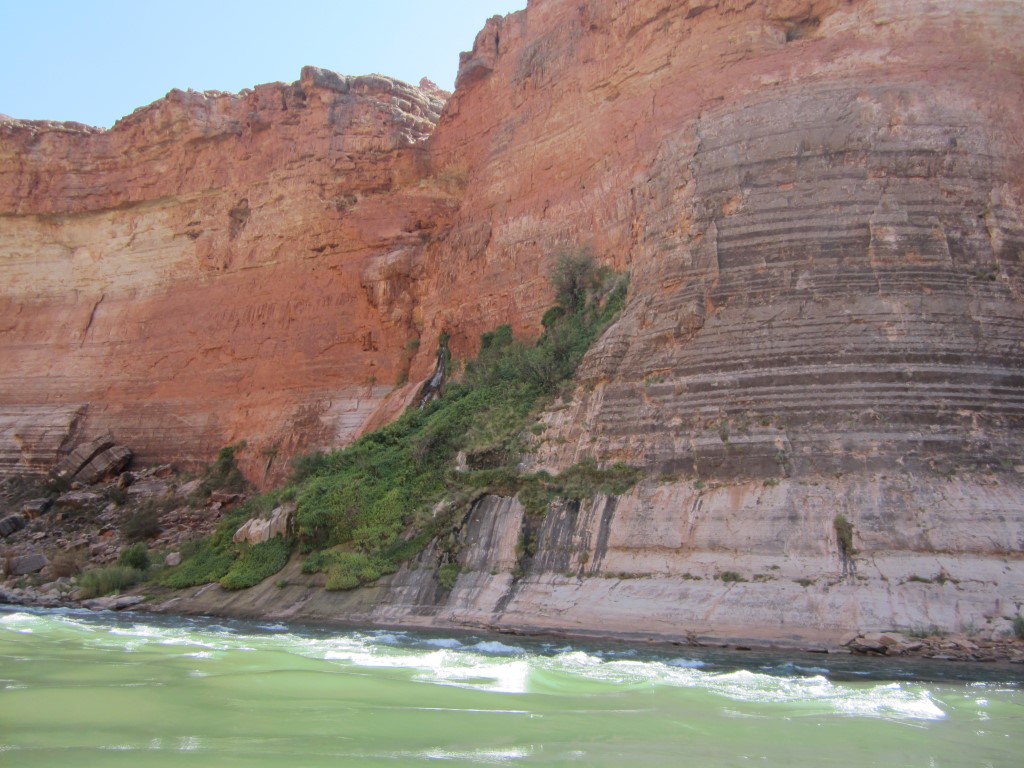No segundo dia, também passamos por Indian Dick . Sim, eles realmente o chamam assim nos mapas. Clique no link para ver uma foto melhor do que a que eu tirei. Depois, passamos por Vasey's Paradise , que é uma nascente que brota da lateral do cânion. Isso acontece com frequência quando um aquífero encontra uma camada de rocha impermeável, então a água encontra seu caminho para fora logo acima dessa camada.