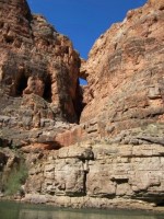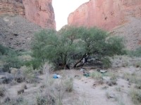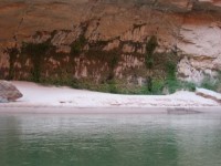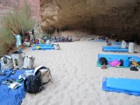 Acho que o lugar onde acampamos é conhecido como "Little Redwall", um pouco depois da milha 34. Era o menor acampamento da viagem, mas muito aconchegante. Tinha uma área comum de areia bem perto da praia, com espaço suficiente ao longo de uma saliência para que cada um pudesse enfileirar seu saco de dormir. Felizmente, não ouvi ninguém roncando, pois estávamos todos ao alcance da voz uns dos outros. Uma das vantagens desse acampamento é que não era preciso andar muito para chegar a lugar nenhum.