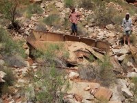 ![]() Suba uma trilha por um desfiladeiro lateral. | ![]() Situação difícil. | ![]() Cachoeira e piscina. | ![]() Vista da trilha que desce. |