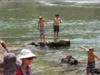Nosso guia no segundo dia foi Curtis e nossas companheiras de viagem eram as irmãs do Havaí, embora uma delas já tenha se mudado para Long Beach, na Califórnia.Pela manhã, atravessamos as "Rugidoras Vinte Rugidoras", uma sequência de corredeiras divertidas e cheias de água, mas nada tão sério que exigisse capacete. Em termos de rafting, esse foi o meu dia favorito.