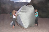 Eles também forneceram uma barraca para duas pessoas para cada duas pessoas. No entanto, isso não foi necessário no nosso caso. Não estava frio o suficiente para justificar uma. Embora agosto seja o mês mais chuvoso no Grand Canyon, vimos apenas breves aguaceiros das 16h à meia-noite. Durante essas chuvas, eu já estava na cama e fiquei satisfeito em me abrigar apenas no saco de dormir. Na primeira noite, acredito que todos os hóspedes, exceto eu, montaram barraca, mas na última noite, não vi nenhuma.
