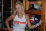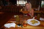 Restaurante Hooters: A comida, tipicamente asinhas de frango Buffalo e cerveja, é a mesma encontrada em todos os outros restaurantes Hooters do mundo. Devo admitir que até que gosto. Uma amiga minha disse que teve desejos por asinhas de frango e tequila do Hooters quando estava grávida. Ela decidiu aproveitar as asinhas, mas dispensar a tequila. Lisa, a modelo da foto, adora os picles fritos deles.