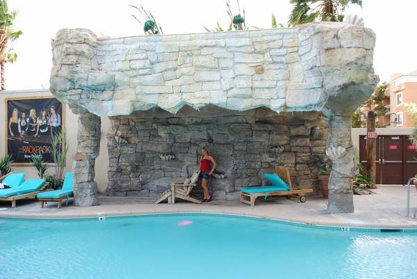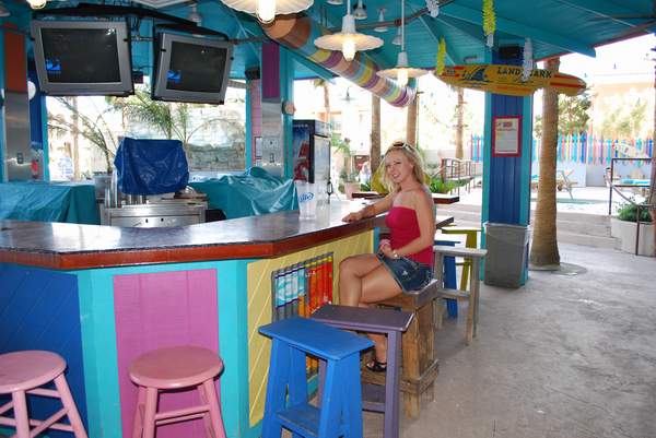 O Hooters oferece uma piscina de tamanho razoável para um hotel do seu porte. Na verdade, são três piscinas, além de duas banheiras de hidromassagem. Ao redor das piscinas, há cerca de 50 espreguiçadeiras, uma dúzia de palmeiras, uma pequena área de areia e uma cascata. A cascata não estava funcionando quando tirei fotos com a Lisa, mas estava com água quando voltei uma semana depois para a minha estadia. O bar ao ar livre "Nipper's" fica perto e serve bebidas, mas estava fechado quando tirei as fotos.