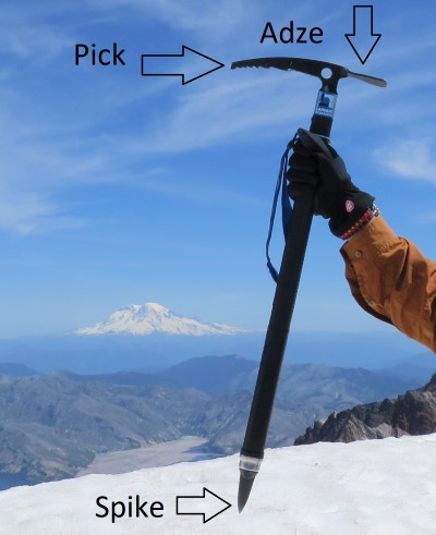 A maneira correta de segurar um piolet ao deslizar na neve é cruzando o corpo com a ponta do lado direito (se você for destro) e pressionando-a contra o gelo de acordo com a velocidade desejada. Isso tornou muito mais fácil controlar minha velocidade e com muito menos esforço. Onde estavam esses bons samaritanos mais acima? Pelo menos ultrapassamos alguns alpinistas subindo a montanha segurando o piolet corretamente. Tenho certeza de que vários outros com quem cruzamos antes da nossa palestra pensaram: "Esses idiotas estão segurando seus piolets errado."
