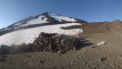 Essa foi a primeira subida para nós dois e não vimos ninguém subindo na nossa direção a uma distância que pudéssemos alcançar durante todo o dia. Eu sabia que queríamos acampar em um lugar chamado Lunch Box Counter, mas não tinha certeza de onde ficava exatamente. Quando a trilha deixava a linha das árvores, ela se tornava praticamente um amontoado de rocha vulcânica. Onde quer que houvesse um lugar plano, as pessoas haviam construído abrigos improvisados para as barracas. Suponho que os abrigos mais baixos fossem para quem planejava fazer a escalada em três dias. Pode ser fácil confundir algumas dessas áreas de acampamento com o Lunch Box Counter. No entanto, não são. Depois de uma área plana com cerca de uma dúzia de locais para acampar, há um longo campo de gelo com inclinação moderada. Leva pelo menos uma hora para subir esse campo e chegar ao Lunch Box Counter, que se estende por uma grande área em ilhas rochosas no meio do campo de gelo. Onde acampamos ficava na parte mais baixa da área do Lunch Box Counter e tínhamos uma grande ilha rochosa, com vários locais para acampar, só para nós.