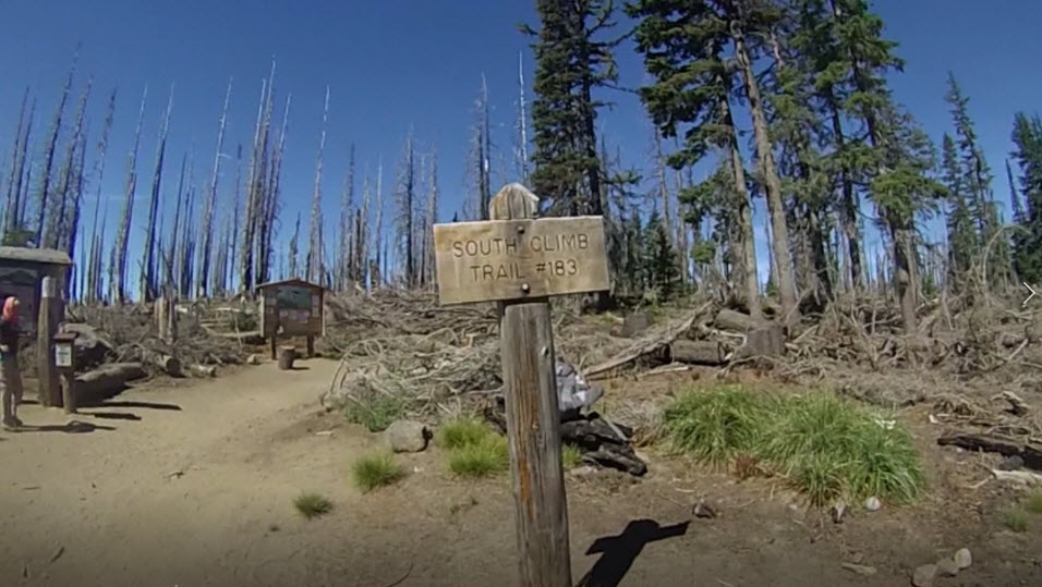 A trilha começa em uma floresta queimada e permanece assim por alguns quilômetros. Embora essa parte da caminhada tenha sido um tanto monótona, fomos recompensados com vistas excelentes do Monte Hood e, mais tarde, do Monte Santa Helena, à medida que ganhávamos altitude. Finalmente, deixamos a área devastada por um incêndio florestal anterior e vimos árvores vivas e campos de tremoços (que eu erroneamente chamo de lavanda no meu vídeo da subida).