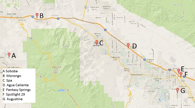 Localizado a cinco horas de carro de Las Vegas e a apenas duas de Los Angeles (com trânsito bom), existe um conjunto de cassinos espalhados pelo Vale de Coachella, onde se encontram Palm Springs e comunidades vizinhas no deserto. Depois de alguma procrastinação, finalmente decidi visitar a maioria dos sete cassinos em Palm Springs e arredores. Considero este post uma continuação do meu Relatório de Viagem a San Diego de 2009 , dada a proximidade. A maior parte desta página foi baseada em uma visita em setembro de 2013. A exceção é o cassino Tortoise Rock, que não estava aberto na época e que visitei em outubro de 2014.