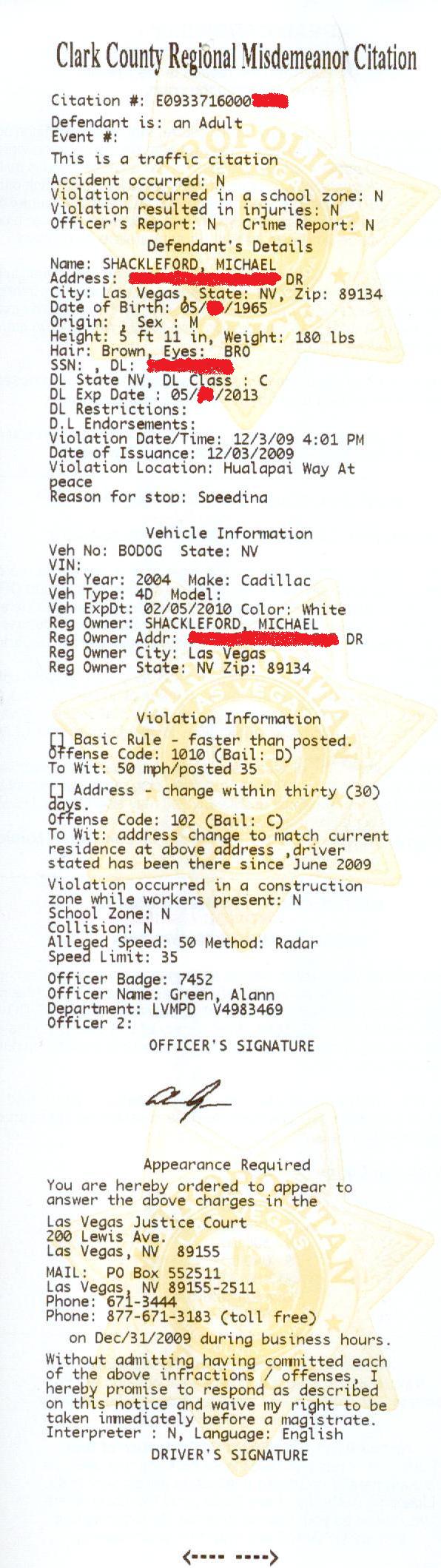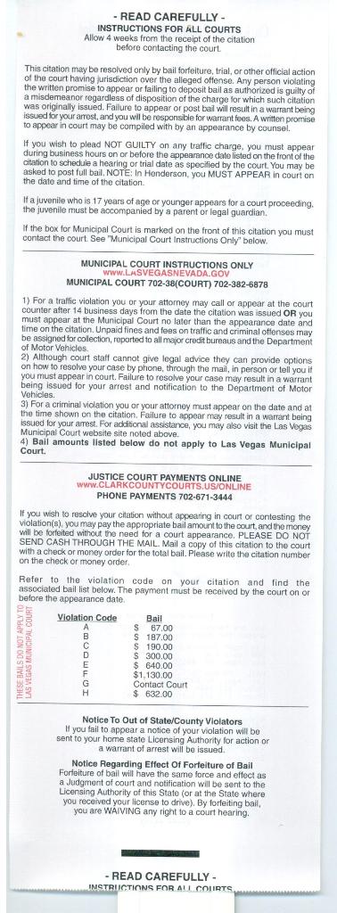 Quando voltei para casa, entrei em contato com a Ticket Whackers. Há outdoors por toda Las Vegas anunciando serviços jurídicos, como o da Ticket Whackers, que contestam multas de trânsito. Me disseram que eles negociam a redução para uma "infração de estacionamento", diminuindo o valor da multa e evitando a adição de pontos à carteira de habilitação. Como eles conseguem fazer isso, ainda não sei ao certo. Perguntei sobre isso no meu site Wizard of Vegas e recebi muitos comentários positivos, mas não obtive resposta direta de ninguém familiarizado com os tribunais de trânsito de Nevada.