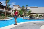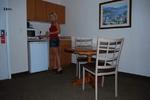 Quando me hospedei lá numa quarta-feira à noite, meu quarto custou US$ 39, mais 12% de imposto estadual de Nevada (a alíquota do imposto tinha acabado de subir). Não precisei esperar na recepção do hotel. Me disseram que a segunda noite custaria apenas US$ 22. Esqueci de levar minha fita métrica, mas os quartos têm aproximadamente o dobro do tamanho de um quarto de hotel normal. Meu quarto básico tinha cozinha, mesa, sofá, cama e um banheiro grande.
