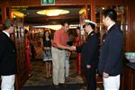 Após o embarque, uma banda se reuniu para recepcionar os outros passageiros à medida que chegavam. Em cada parada do cruzeiro, a tripulação se alinhava para nos dar as boas-vindas. Às 16h, o navio "zarpou", embora não houvesse vela alguma naquela embarcação de cinco andares. Às 17h30, tivemos uma apresentação de boas-vindas. A parte sobre segurança foi bem breve. O diretor de cruzeiro disse que nunca havia ocorrido um acidente no navio e que era impossível ele afundar (tenho quase certeza de que disseram a mesma coisa sobre o Titanic). No entanto, na improvável hipótese de algo acontecer, fomos instruídos a simplesmente seguir as instruções transmitidas pelo alto-falante. Às 18h45, o capitão ofereceu uma recepção de boas-vindas, da qual não participamos, e às 19h30, o jantar foi servido.