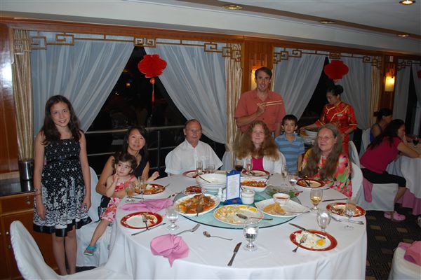 Antes de prosseguir, todas as refeições, especialmente os jantares, a bordo do navio foram excepcionais. No café da manhã e no almoço, havia uma mistura de pratos ocidentais e chineses disponíveis no buffet. Com exceção da primeira noite, os jantares foram servidos no estilo chinês, ou seja, vários pratos eram colocados em uma bandeja giratória no centro de uma mesa redonda. Os passageiros podiam se servir à vontade. Sempre serviam muito mais comida do que conseguíamos comer. Era um desafio manter a disciplina e não comer demais (estou tentando manter meu peso abaixo de 79 kg). Todos os jantares foram excelentes; foi uma das melhores comidas chinesas que já provei. A comida era mais autêntica do que a que se encontra na maioria dos restaurantes chineses americanos, mas mais suave do que a que se encontra em um restaurante chinês voltado para o público chinês. Era um equilíbrio delicado de se encontrar, mas o chef conseguiu.