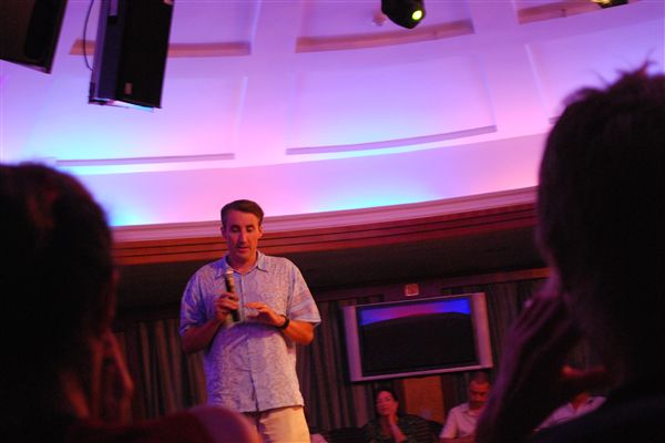 Quase todas as noites o programa anunciava karaokê no salão, mas nunca vi ninguém cantando e não era fácil saber como começar. Talvez alguém da equipe devesse dar o pontapé inicial cantando primeiro.