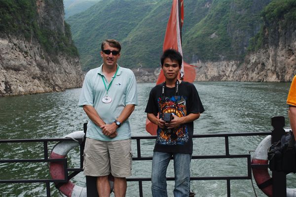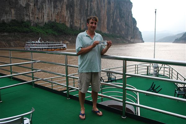 Às 17h25, atravessamos o Desfiladeiro de Qutang, o terceiro dos três desfiladeiros. Este é o mais curto, mas o mais bonito dos três. O verso da nota de 10 yuans chineses traz uma imagem deste trecho. À noite, houve um show de cabaré, no qual os passageiros foram convidados a participar. Eu me ofereci para fazer stand-up comedy. Expliquei especificamente ao diretor do cruzeiro como ele deveria me apresentar, pois isso me levou à minha primeira piada. No entanto, o guia fluvial acabou sendo o mestre de cerimônias, e minha apresentação foi: "Aqui está Michael para fazer alguma coisa". O diretor do cruzeiro me avisou que nosso grupo de passageiros não tinha senso de humor nenhum, e ele estava certo. A maioria das pessoas que optaram por participar eram idosas, muitas das quais talvez não falassem inglês fluentemente. Acho que não me saí tão mal desde meus palpites da temporada de 2005 da NFL.
